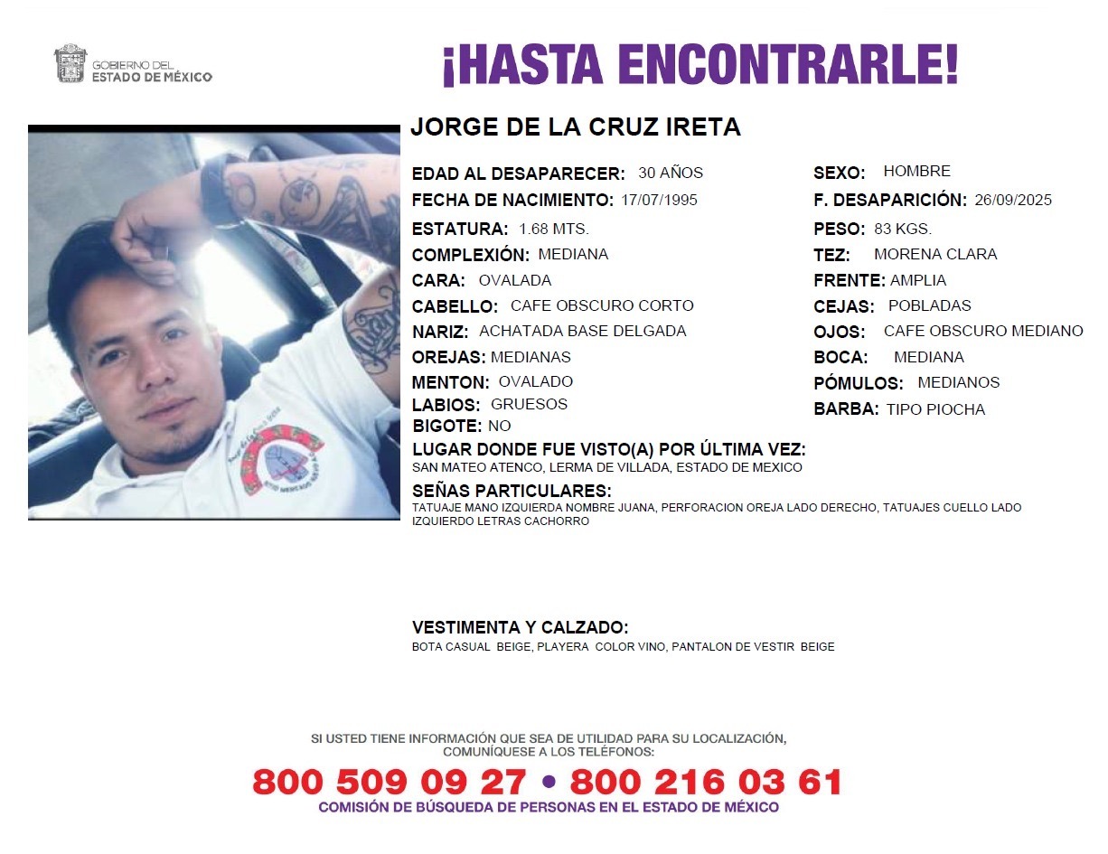 Tepetlaoxtoc, Méx., a 2 de octubre de 2025.– Familiares y amigos de Jorge de la Cruz Ireta, de 30 años, denunciaron su desaparición luego de haber sido detenido el pasado 24 de septiembre durante un cateo realizado en un predio del barrio El Calvario, en Tepetlaoxtoc.