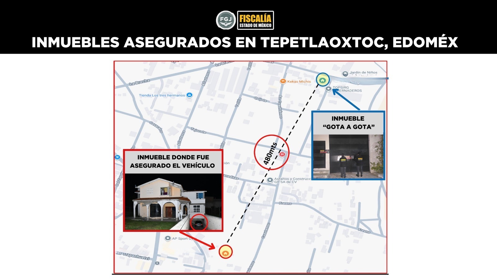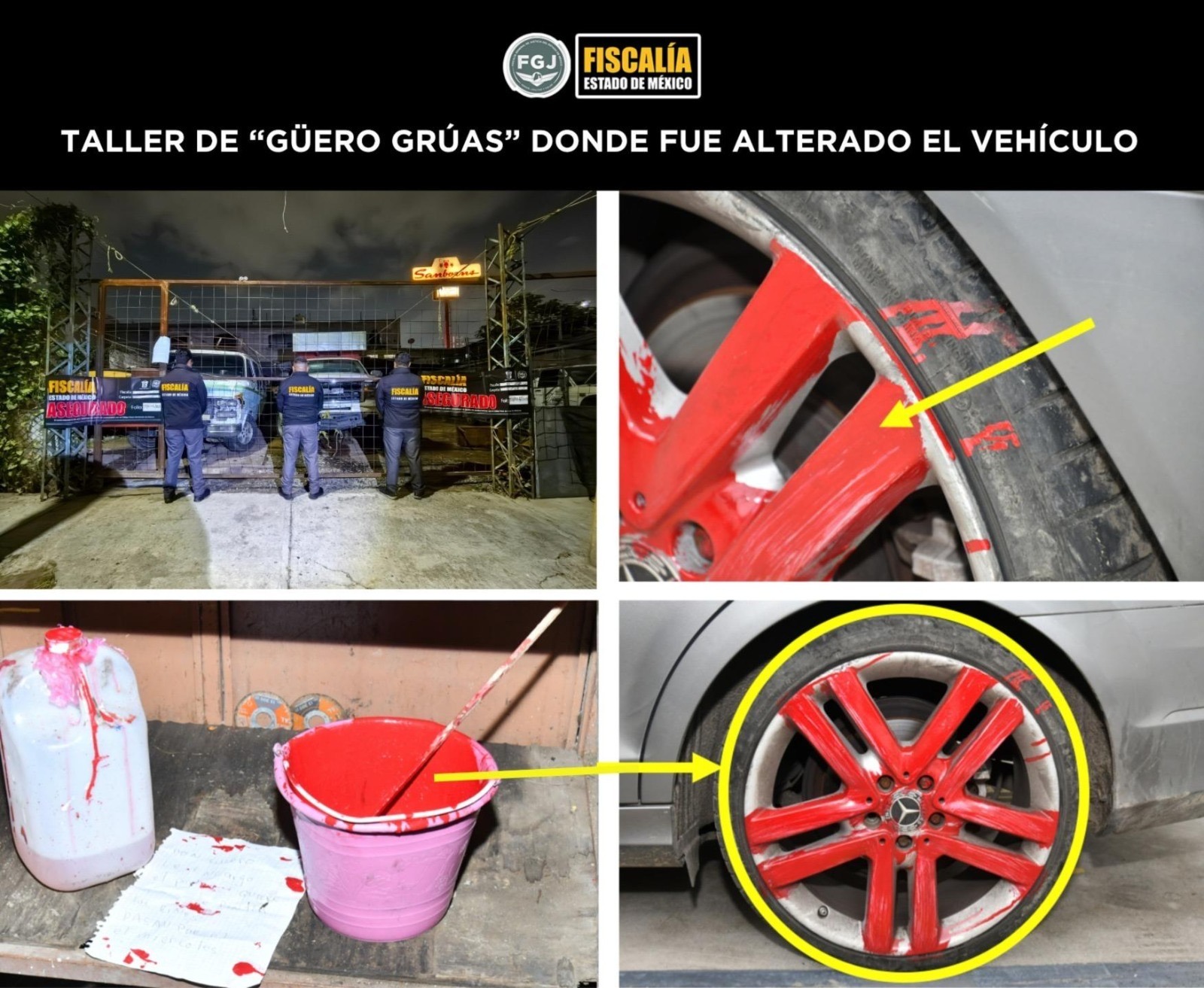 Como parte de los actos de investigación, se rastreó un Mercedes-Benz color plata sin placas, observado con las víctimas el 16 de septiembre. La unidad fue ubicada en Tepetlaoxtoc con rines repintados; en su interior se encontró un vaso con popote en el lugar que habría ocupado “B-King”. Prueba genética confirmó coincidencia de ADN con la víctima. Se ejecutaron cateos en un taller de hojalatería de La Paz —donde se aseguró pintura coincidente con la aplicada a los rines— y en domicilios de Nezahualcóyotl vinculados a Jaime “N” (“Puga”) y su red de reparación y ocultamiento del vehículo.