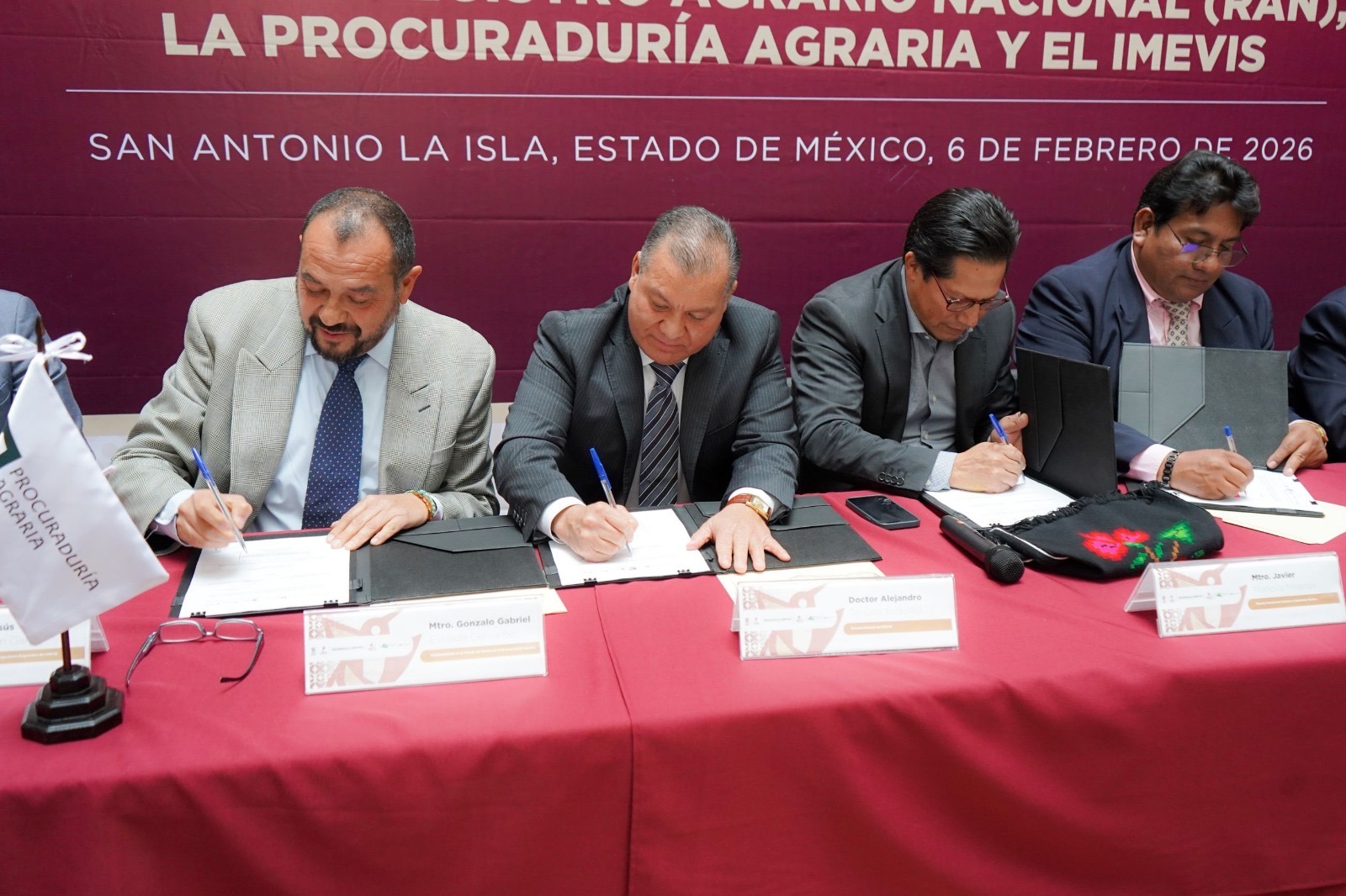 EDOMEX. El Gobierno del Estado de México, a través del Instituto Mexiquense de la Vivienda Social (Imevis), firmó un Convenio de Coordinación y Colaboración con el Registro Agrario Nacional (RAN) y la Procuraduría Agraria para fortalecer la regularización del suelo y la tenencia de la tierra en ejidos y comunidades, con un eje central: que los trámites sean gratuitos para la ciudadanía. El acuerdo se formalizó en San Antonio la Isla, Estado de México.