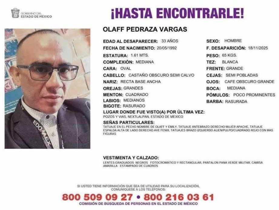 Olaff Pedraza Vargas, de 33 años, cuenta con tatuajes distintivos en pecho, espalda y brazos. Fue visto por última vez en Pozos y Vías, Nextlalpan. Su familia y compañeros reiteraron su compromiso de continuar la búsqueda.