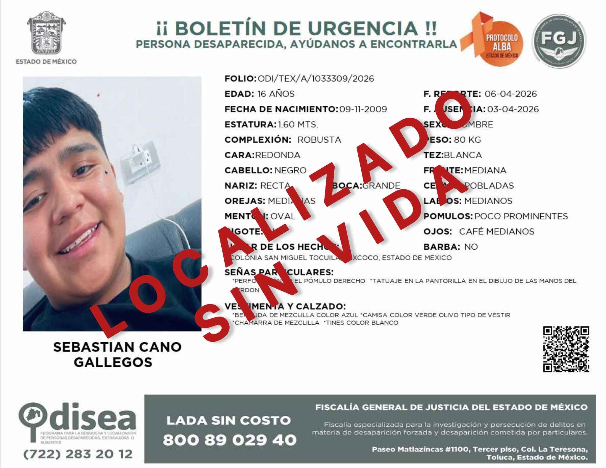 El menor había sido reportado como desaparecido desde el pasado 3 de abril, luego de salir de su domicilio en el poblado de Tocuila, en el municipio de Texcoco, sin que desde entonces se tuviera información sobre su paradero.