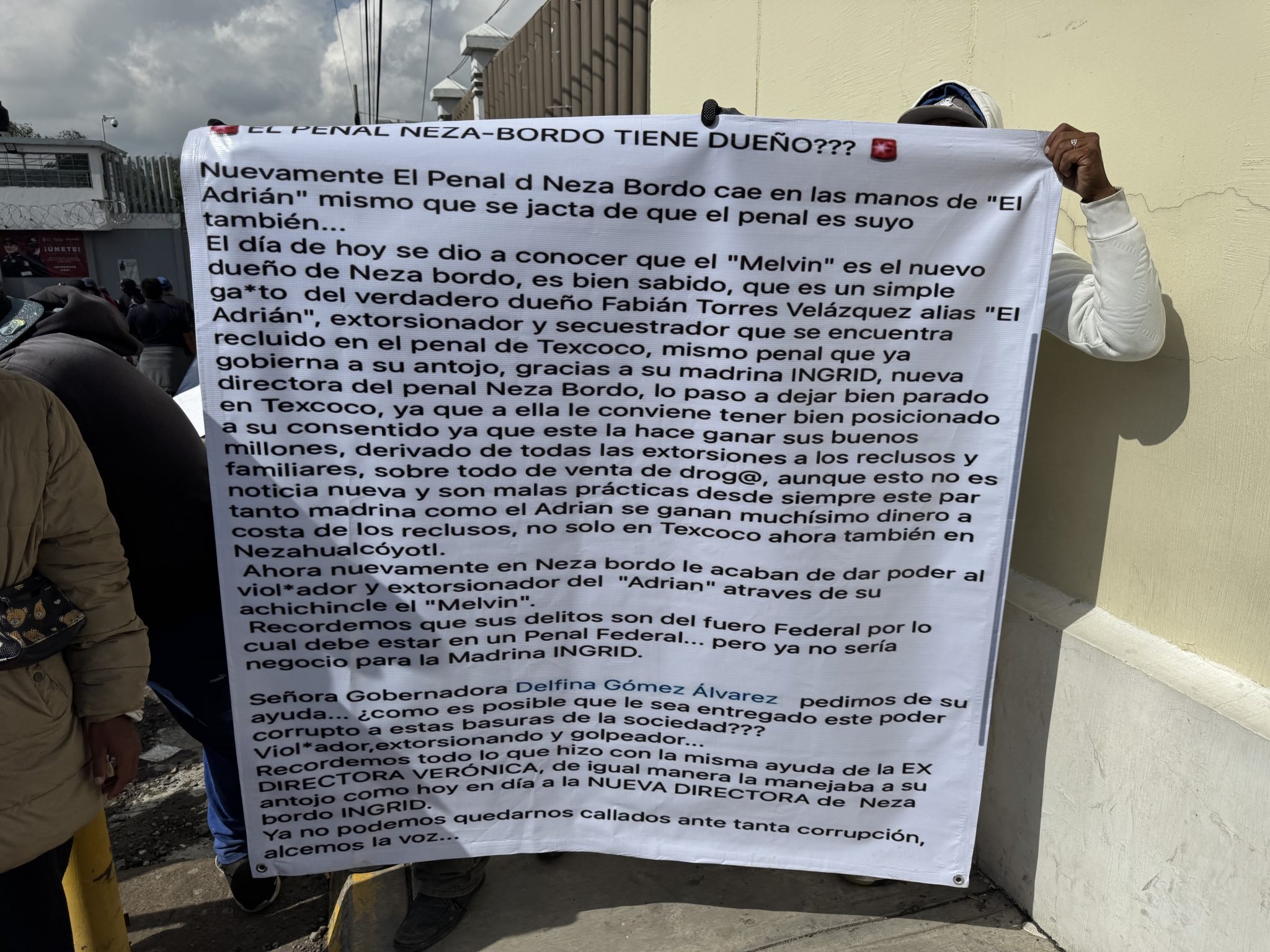 Durante los primeros días de agosto, familiares de Personas Privadas de la Libertad (PPL) realizaron protestas simultáneas en los penales de Chalco, Chiconautla (Ecatepec), Molino de Flores (Texcoco) y Bordo de Xochiaca (Nezahualcóyotl) para exigir el traslado de Fabián Alejandro Velázquez Torres, alias “El Adrián”, a un penal federal.