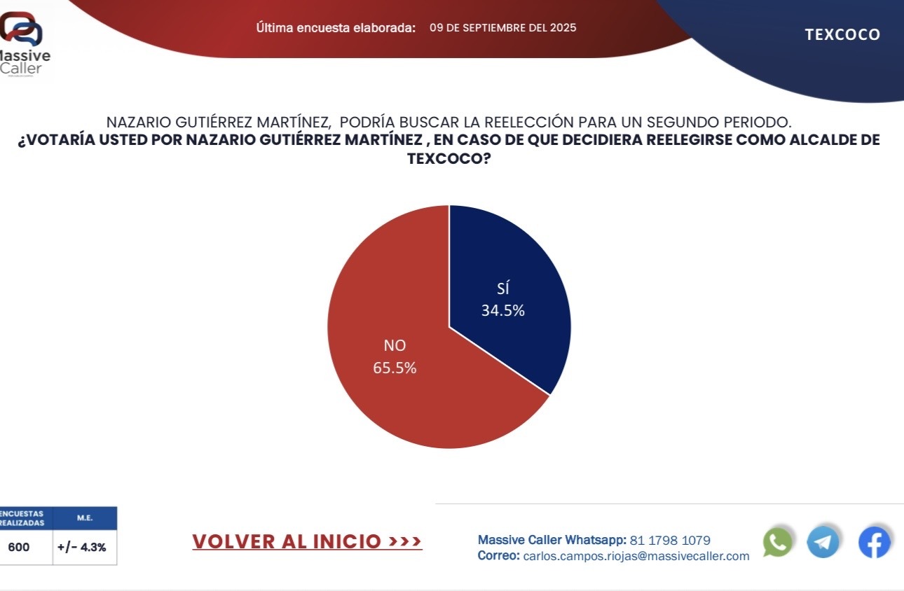 Texcoco, Méx., 13 de octubre de 2025. De acuerdo con la encuesta de Massive Caller, el alcalde Nazario Gutiérrez Martínez enfrenta un panorama adverso: 65.5% de los texcocanos no votarían por su reelección, reflejo del desgaste político y social de su gobierno.